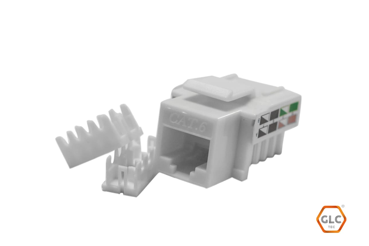 De la línea de conectores GLC categoría 6. El JACK CATEGORÍA 6 GLC es aplicable para Sistemas de Cableado Estructurado para transmisión de voz, datos e imágenes, según requisitos de la norma ANSI/TIA/EIA-568B.2-1 (Balanced Twisted Pair Cabling Components), también para cableado horizontal o secundario y uso interno en punto de acceso en el sitio de trabajo para tomas de servicios en sistemas de cableado estructurado.