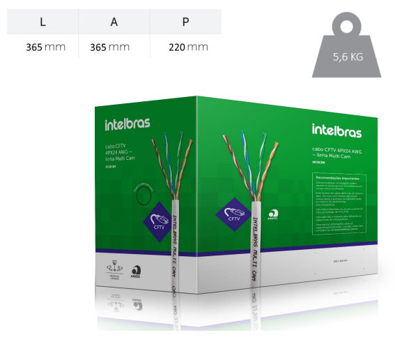 Producto: Cable de red UTP CCTV 4PX24AWG MC8CBR MULTI CAM (BOB 300 m) IntelbrasEl cable MC8CBR es ideal para la instalación y aplicación de varias cámaras en sistemas de CCTV analógicos. Los cables tienen un conductor interno de cobre y aluminio, que conecta varias cámaras en un solo cable o utiliza balunes de alimentación para la alimentación y la transmisión de datos. Aprobado por ANATEL. Cablede aluminio chapado en cobre de 8 vías y 24 AWG;de impedancia de 100 ohmios;cubierta aislante de PVC;sin blindaje;Uso interno.Conexión de varias cámaras en el mismo cableUn solo cable conecta la alimentación y varias cámaras, lo que reduce los costos al tener más cables.Sistema más seguro y confiableCuenta con una cubierta aislante externa de PVC que garantiza una mayor protección y seguridad.Solución completa con la familia de cables IntelbrasMulti Cam que está totalmente integrada con los productos de seguridad electrónica de Intelbras (cámaras, DVR, baluns y power baluns).Especificaciones técnicasModelo: cable CCTV Multi CAM 4PX24 AWG 300 MAplicación: sistemas de CCTV analógicosAislamiento de conductores: PVC con un diámetro nominal de 0,90 mmConductores: aluminio chapado en cobre de 24 AWGFunda: PVCEléctrico resistencia (20C): 260,6 ohmios/kmImpedancia característica: 10015 ohmiosPara voltajes de trabajo: < 57 Vcc (48 Vcc nominales)Potencia relativa a la distancia de cableado20 m: 8,5 W/0,791 A40 m: 4,3 W/0,396 A60 m: 2,8 W/0,264 A80 m: 2,1 W/0,198 A100 m: 1,7 W/0,158 ATabla de valores de referencia de distancia de cableado de línea de cable de Intelbras obtenidos en el laboratorio para proyectos de CCTV analógicos*Cámara de 720p: solo vídeo de 250 m/Vídeo con fuente de alimentación de 100 m (consumo de 180 mA y 240 mA)Cámara 1080p: solo vídeo de 200 m/Vídeo con fuente de alimentación de 100 m (consumo de hasta 220 mA), 50 m (consumo de hasta 650 mA)Cámara de 4 MP: solo vídeo de 120 m/Vídeo con 80 m de potencia (consumo de hasta 253 mA), 60 m (consumo de hasta 290 mA)Cámara 4K: solo vídeo 120 m/Vídeo con alimentación de 40 m (consumo de hasta 470 mA) /10 m (consumo de hasta 1,22 A)